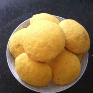 把南瓜面揪成小面团,用擀面杖把南瓜面擀成薄饼状,并放入之前调好的馅儿,包成包子状用掌心压扁就好