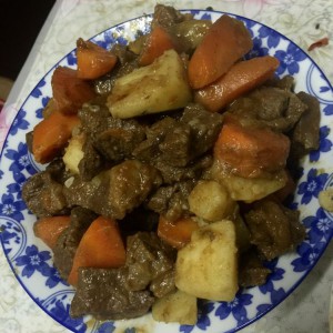 待牛肉用筷子能扎透的时候再放入土豆和胡萝卜,放的太早容易烂掉