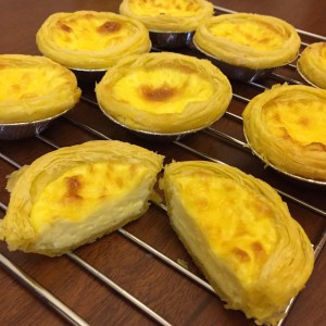 每个挞皮中蛋液倒入百分之八十,放入烤箱最低层,上下火温度200,烤至5分钟