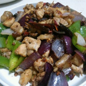 另起锅放少许油,锅中加入麻椒辣椒爆香。放入青椒洋葱同炒。