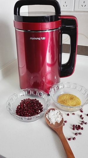 浸泡后的红豆、小米连同浸泡的水,一同倒入豆浆机中;