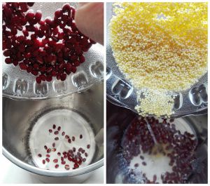 红豆、小米洗掉浮灰,用清水浸泡2个小时;