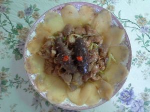 下大蒜爆香,放天麻翻炒均匀,放刺參一起翻炒