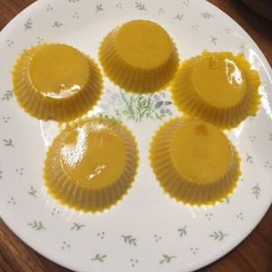 几小时后就可以取出,反扣再盘中就可以吃啦,隐约可见果粒哦!我用的是硅胶模具,小孩子不好拿,所以取出来放在盘子里吃比较方便,也比较漂亮。如果用硬的模具也可以不倒扣出来。