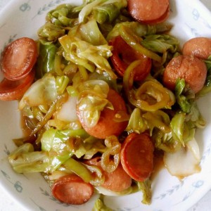 腊肠炒至变色后加入包菜和辣椒,大火急炒,加入白醋和生抽,继续炒熟,临出锅前加盐,翻炒均匀即可出锅