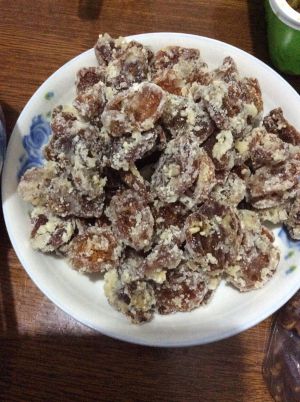 重要是来了,不能停随着温度下降杏干会粘在一起,用筷子把它们都分开,慢慢的上面就有了糖霜了。好了装盘!