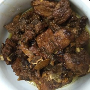 加入适量蒜瓣和水。水量刚淹到排骨。盖上锅盖小火慢慢焖煮直到骨酥肉烂时大火收汁。