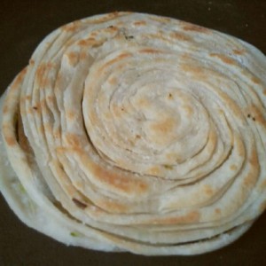 醒好的面条取适量擀成长方形,涂上酥油撒上葱花从两头开始卷成一大条。然后将揉好的一大条从中间竖刀切成两条,中间切面朝上横着卷成圆形。擀薄后放入电饼铛,直至熟透即可食用。