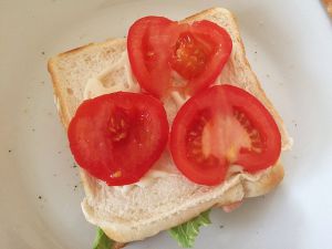 再盖上一片吐司 撒上蛋黄酱 再铺一层西红柿