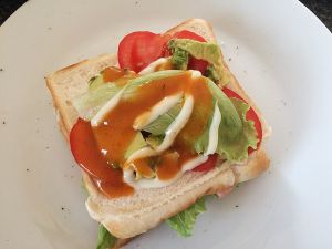 最后撒上一层蛋黄酱和peri-peri酱 盖上切片吐司