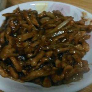 切好葱丝加入肉丝,加甜面酱,加少许酱油