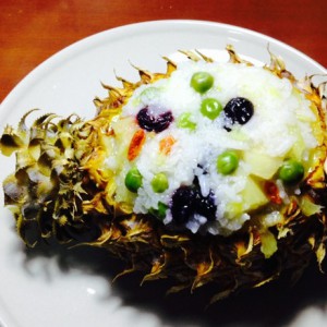 蒸好的糯米,加入豌豆,菠萝丁,葡萄干,枸杞。