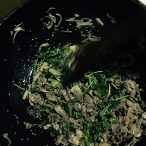 待肉变了颜色,加入调料,最后出锅多放些香菜段,提味儿!不喜欢的可以放红辣椒活着青椒丝啊!