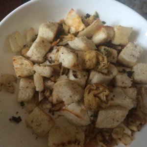 先大火爆炒鸡蛋, 搅碎些, 盛出待用。 中小火, 放入馒头丁康一康5-8分钟, 再把馒头丁拨开中间大火加油, 入蒜苗炒; 鸡蛋等都入锅快翻。 少许盐胡椒, 出锅了! 厨房都是鸡蛋, 蒜苗和馒头的香味!