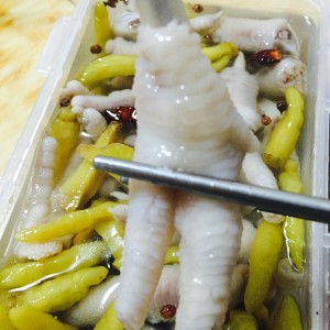 然后再保鲜盒里倒入适量的冷开水再放入洗好的鸡爪