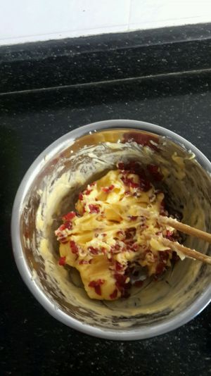 蔓越莓干(大块的要切碎)放进搅拌好蛋液的黄油中