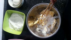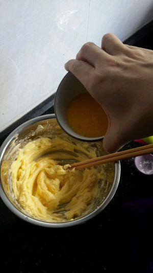 鸡蛋打散(记得分离出半个,只用半个),分两到三次加入到黄油盆中