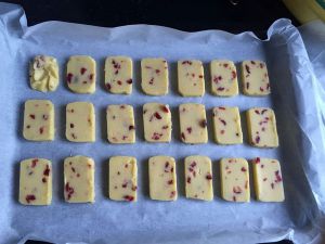 这个时候烤箱预热,170度。饼团切开大概3cmx5cmx7mm的尺寸,放进烤盘里,要有一定的间隙,不然会黏在一起