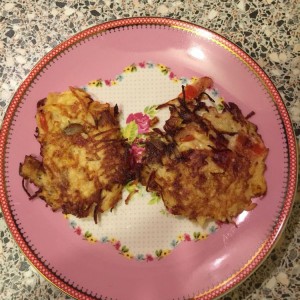 打入两只鸡蛋,加糖和盐少许,可加生粉,并搅拌,记得别让里面残留太多水分(水分太多会导致饼难成形)