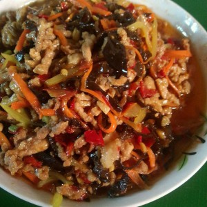 准备所有材料:瘦肉切丝,泡红椒剁碎,姜蒜切碎,木耳,胡萝卜,莴笋各切丝待用,小葱切段儿,调制鱼香汁(陈醋一小勺,生抽一小勺,淀粉适量)