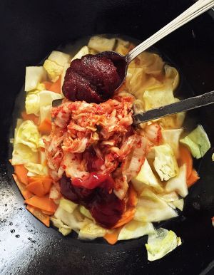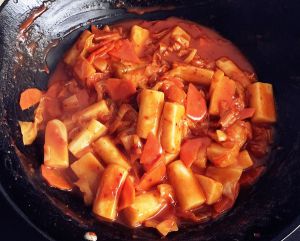 加入清水、辣椒酱、泡菜、番茄酱、年糕翻炒,要想吃最地道的口味需添加鱼饼。