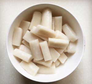 年糕切条煮软备用。