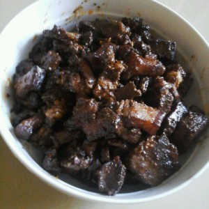 剩少许油放冰糖炒上色。在放入五花肉。把备好的调料,老抽,生抽,酱豆腐一起放入。