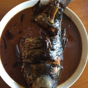 热锅放油,油热后放入生姜,辣椒,再把鱼放入,把葱段也放入,把鱼煎得老一点(土话说煎得要上),煎的时候可以稍微动一动,因为有些地方可能煎不到,一面差不多了再翻身,煎另一面,