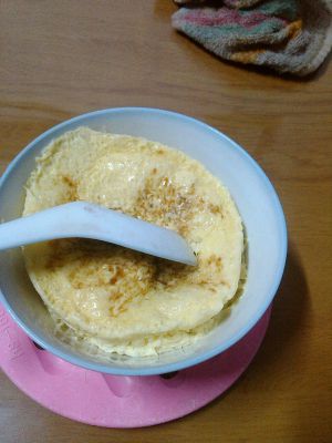 出微波炉后,鸡蛋本来是膨胀的,遇到空气会缩小,淋酱油就可以吃了。