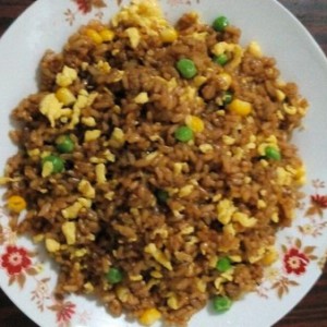 鸡蛋一个炒熟,豌豆玉米粒焯水备用,葱切沫。热锅放油爆香葱沫,然后放搅拌好的米饭,炒一会放蚝油,待炒匀后放鸡蛋豌豆玉米粒即可出锅。根据个人口味可以适当放点盐。
