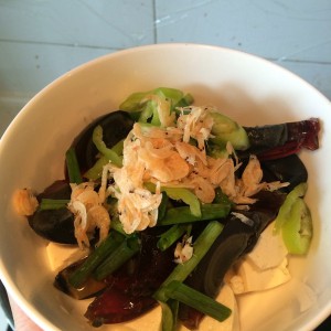 将皮蛋,豆腐,小葱,虾米,青椒放入碗中,加醋两汤匙,酱油一汤匙,糖一小勺,盐两勺,拌匀。