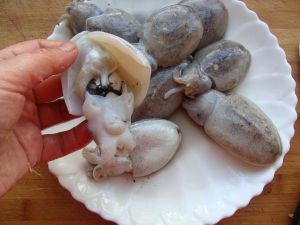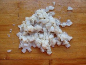 小墨鱼只留头部,去掉内部所有脏器,洗净,撕去表皮黑膜,切成小粒。