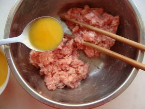 将绞好的肉馅,加入料酒和蛋液进一步搅拌上劲。