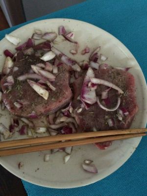 首先是腌制牛排 :牛排1.25厘米的厚度比较好 用刀将牛肉排拍松 然后用刀在肉上斜着划出菱形的格子 把鲜柠檬挤汁均匀洒到牛排上 放入迷迭香 然后加入少量食用盐 黑胡椒粉 红酒 少量切丁洋葱 腌制30分钟备用