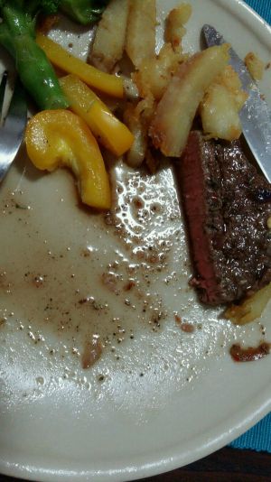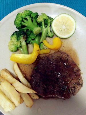 摆盘 多余的汁浇在牛排上 我另外还自制了薯条 哈哈看着还不错吧 味道也不错呢