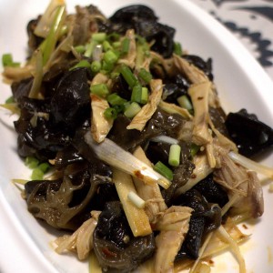 4:将木耳、大葱、大蒜、鸡丝所有配料放到一起,放上酱油、鸡精、醋、盐、辣椒油拌起来