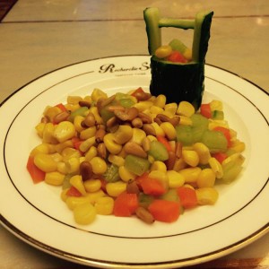 放油 预热 加入葫芦卜 黄瓜 最后玉米粒的顺序 放糖放盐 一定要勾芡 加淀粉和水 再放一点里面的汁 摆盘