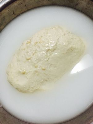 然后加入冷水,水没过面团,像洗衣服一样揉洗面团,直到水变白,面团变黄色就是面筋(期间换两次水,但不能倒掉)