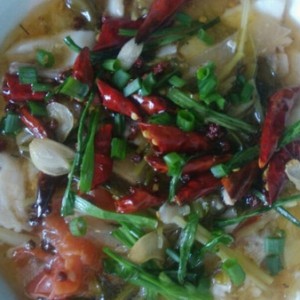另外起锅,放油,将干辣椒,花椒,葱段放入,糄炒香味飘出。将另外锅里的鱼片盛出,放在汤碗里,然后将锅里的油和辣椒花椒淋在碗里。撒上葱花。香喷喷的酸菜鱼片出炉啦!