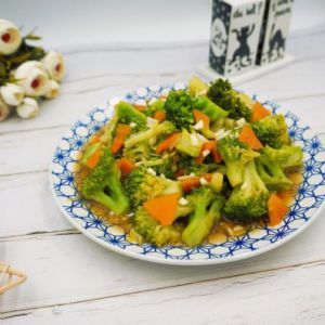 蒜香后,西蓝花和红萝卜一起倒入锅内翻炒