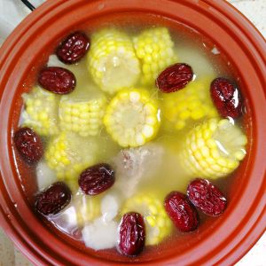 2把准备好的排骨、玉米、山药、红枣、一起倒入煲中。