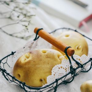 排气,我是做4个土豆,分成85克的小面团,揉光滑后做成椭圆形,剩下的滚圆做普通款,盖保鲜膜备用;