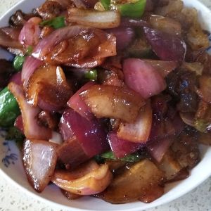 肉放冷水煮熟切片,洋葱洗净切好备用,辣椒切块备用,锅烧热下肉炒成卷起来,下豆瓣酱白砂糖酱油醋适量翻炒,放入洋葱炒熟入味,放少许盐,鸡精花椒翻炒均匀,出锅,