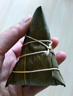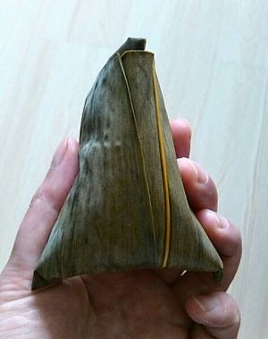 将粽叶头尾上折捏拢粽子就包好啦!