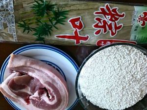 提前一天五花肉去皮切块,黄酒生抽老抽盐糖姜片腌制,密封放冰箱过夜,肉腌得可以偏咸些,粽子煮后咸味会溶到水里一些。