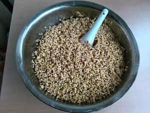 放一勺米。