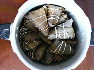 都进高压锅里去。加水没过粽子,煮1个小时。