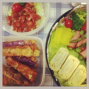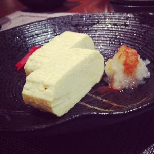 取出厚蛋,可用竹帘整形并让厚蛋更密实!切块装盘,配上白萝卜泥,再点上辣椒酱!也可配红姜或者福神渍!这是我弁当里做的,弁当里的厚蛋我更喜欢蓬松柔软口感的,所以没有整形!
