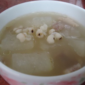把清水放入锅中煮开,把刚刚洌干水排骨、姜放入锅中煲20-30分钟,倒入薏米、冬瓜,再煲10-15分钟,看大小火力,主要是排骨煲烂了,薏米、冬瓜熟了。加盐、搅拌,再煮一分钟,关火。