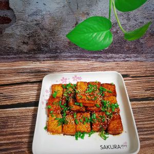 酱汁调好后,准备材料,老豆腐切块,沥干水分后再用厨房纸吸干。白芝麻适量,香葱碎适量。